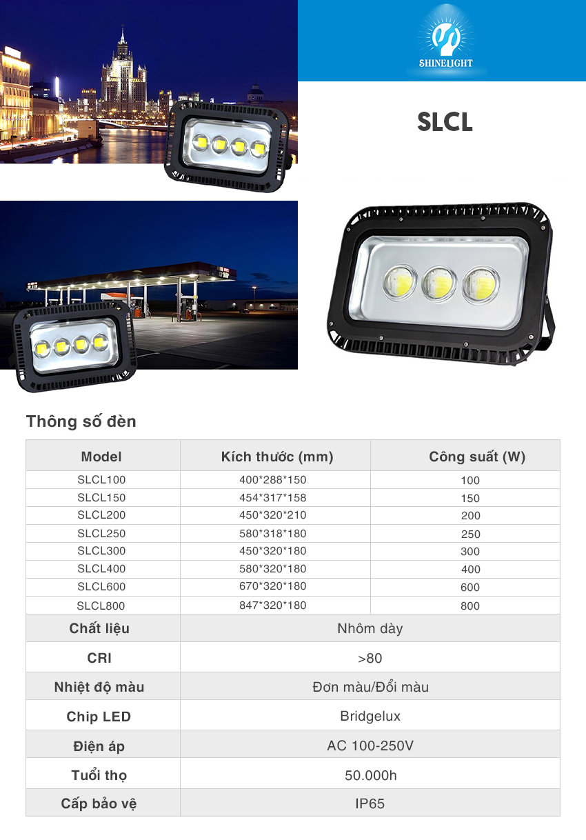 - Đèn Pha Led SLCL thay thế đèn truyền thống trong chiếu sáng mặt tiền, chiếu sáng cây xanh, chiếu sáng bảng hiệu quảng cáo, sân vườn, sân bóng mini….