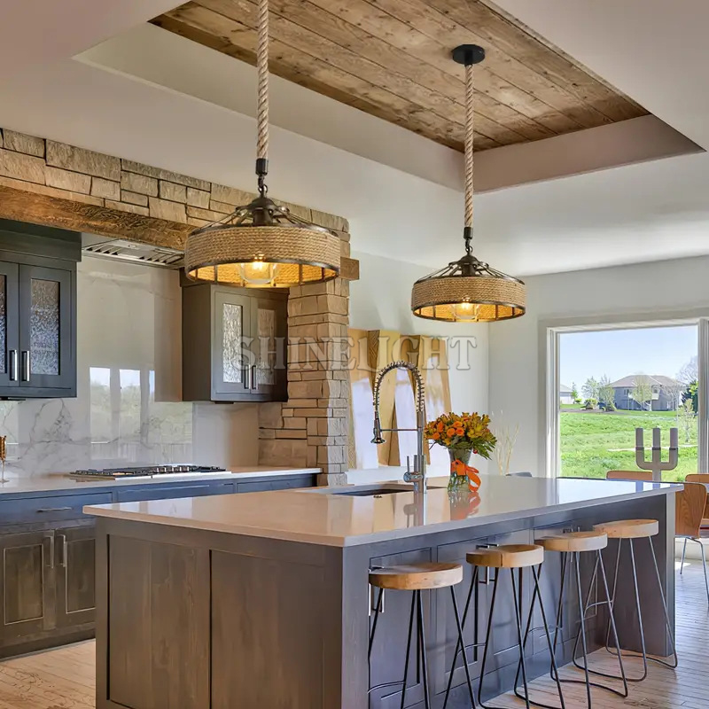 Phần khung đèn làm từ hợp kim cứng cáp, đảm bảo độ bền cao và khả năng chống gỉ sét tốt. Sự kết hợp khéo léo với dây thừng thô mộc không chỉ tạo sự tương phản thú vị mà còn khiến tổng thể đèn trở nên hài hòa và thân thiện hơn trong mắt người dùng.